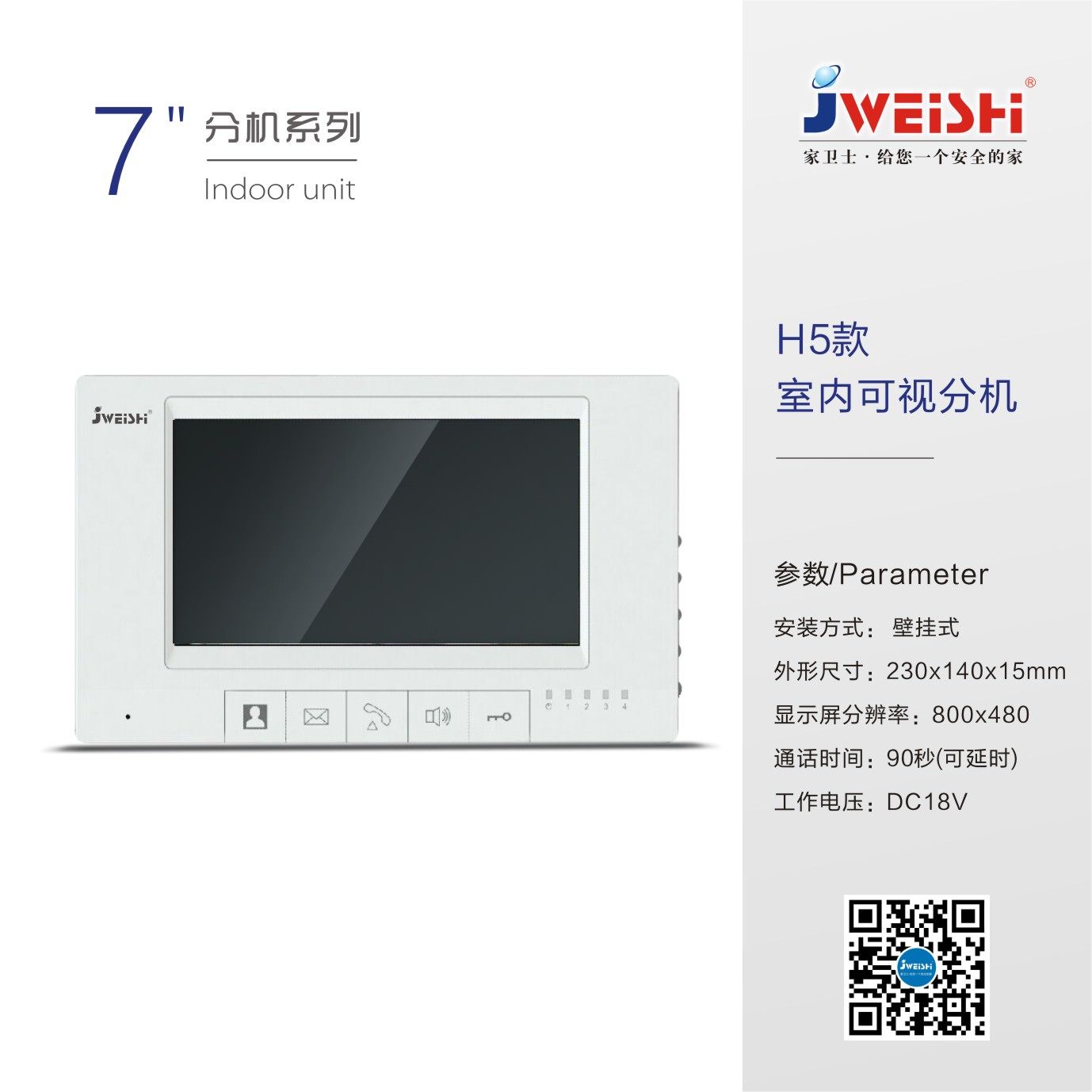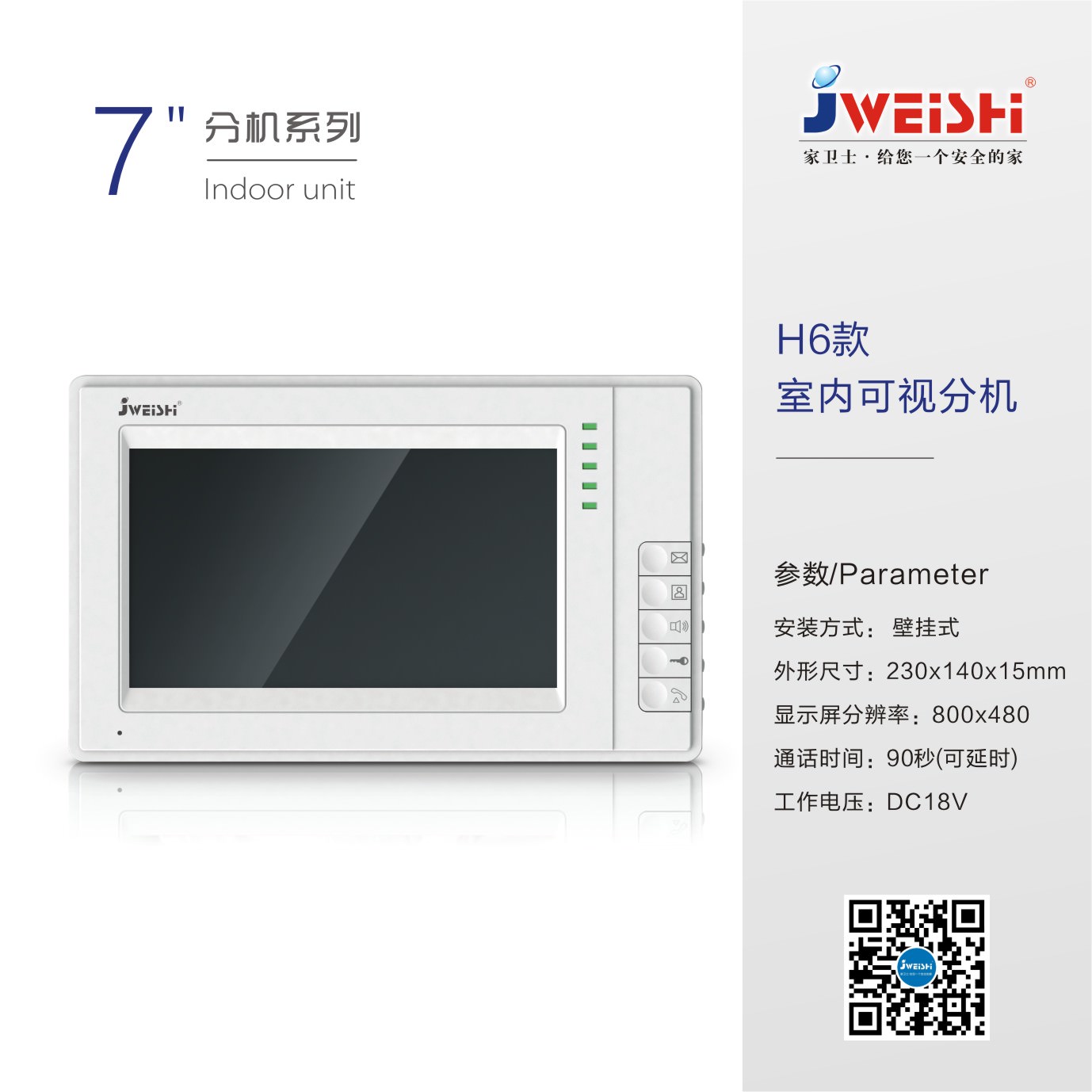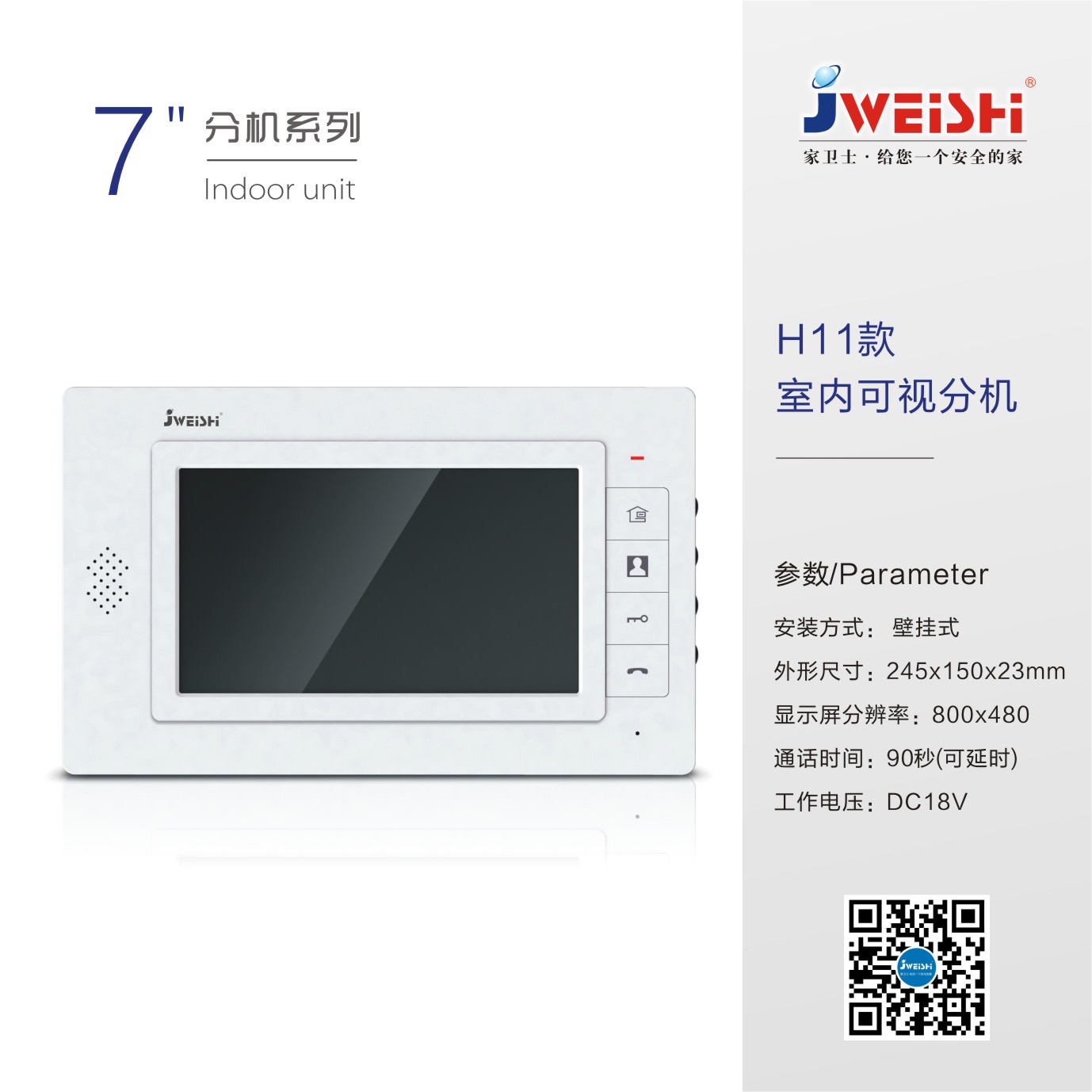 显示屏:7寸TFT显示屏分辨率:800*480安装方式:壁挂式 外形尺寸:230*150*23(mm)振铃时间:30秒通话时间:90秒(可延时)