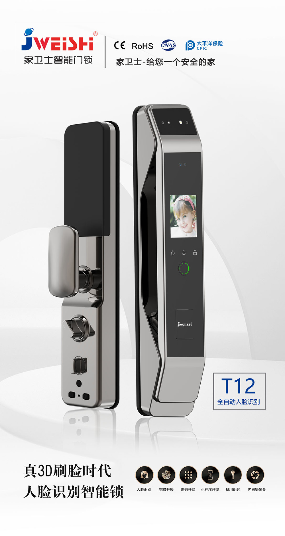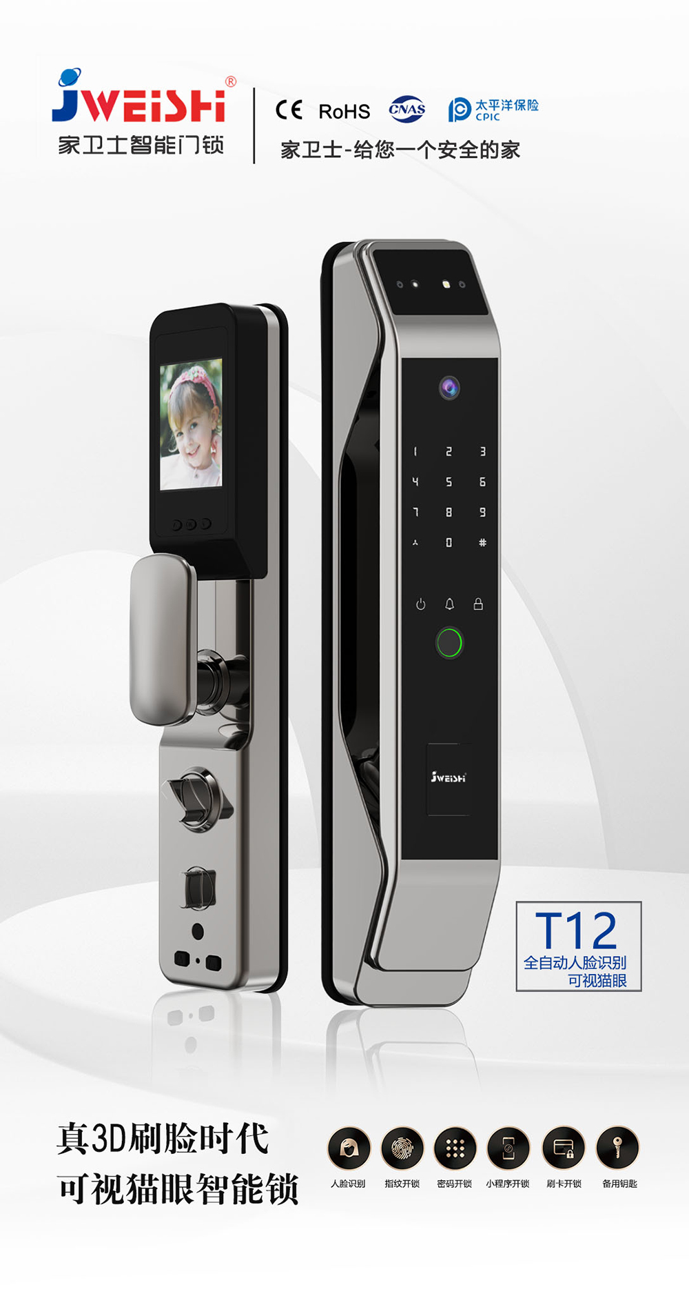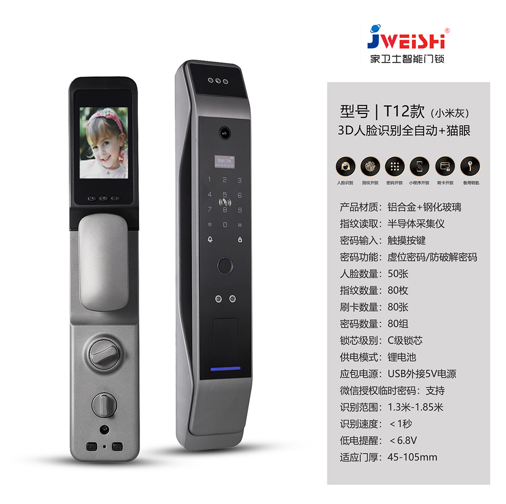 - 猫眼、防撬报警、虚位密码防窥视、延时自动上锁、逗留抓拍、主动监控、低电量报警、AI语音提示、支持多国语言