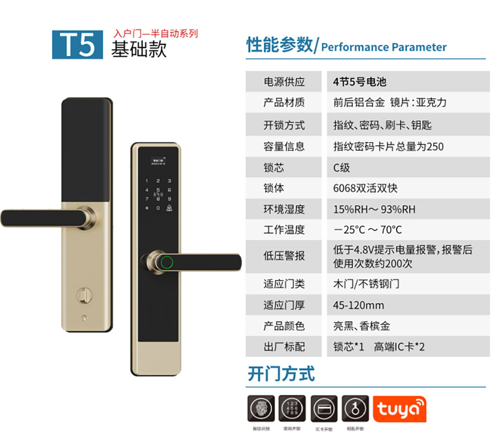 - 防撬报警、虚位密码防窥视、延时自动上锁、试错报警、低电量报警、AI语音提示、支持多国语言、应急充电