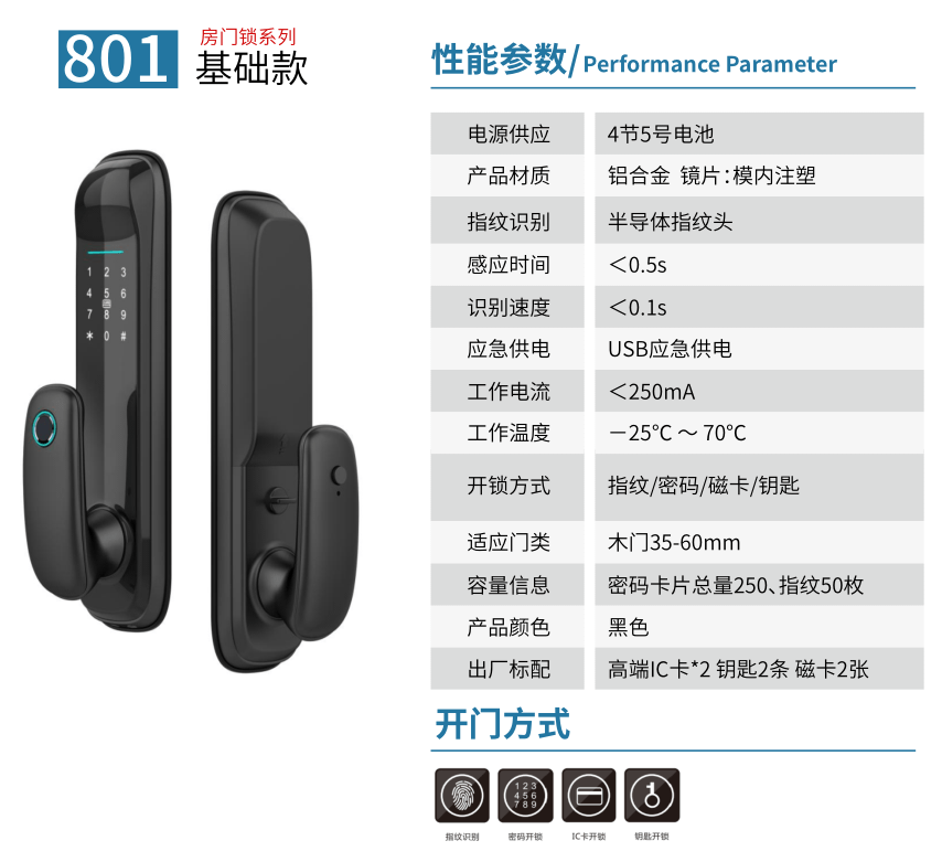 - 开锁方式:指纹,密码,卡片,钥匙,APP解锁(选配)