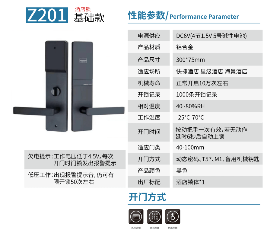 开锁方式:刷卡、机械钥匙、TTHOTEL APP、TTLOCK APP