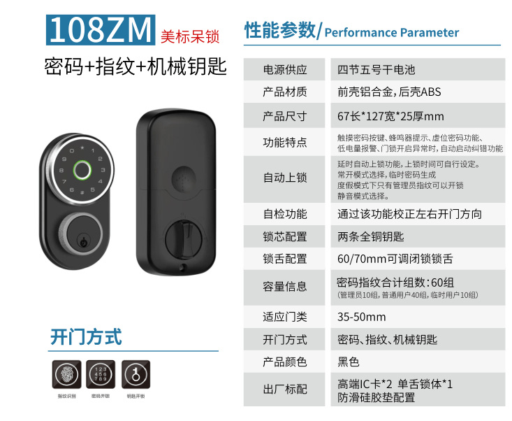 防撬报警、虚位密码、延时自动上锁、应急供电